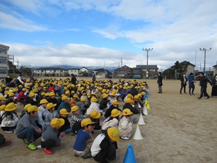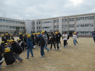 業間休みに、地震を想定した避難訓練を行いました。今日は、「学級以外の場所にいるときに地震が起こった」という想定の訓練です。運動場で遊んでいた子どもたちはグラウンドの中央付近でしゃがみました。校舎内にいた子どもたちは机の下に入るなどして頭を守り、「揺れが収まりました」の放送が入った後、運動場に続々と避難してきました。