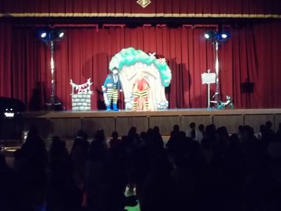 体育館の入口には大きな鬼の口…。「食べられる!」と言いながら入場する子どもたち。何が始まるか、興味津々です。赤鬼さんや青鬼さんがステージに登場した時には、大歓声が起こりました。眠っている赤鬼さんを声楽アンサンブルの皆さんと一緒に歌って起こしたり、青鬼さんが去っていくときには「青鬼があっちにいる!」と赤鬼に伝えたりと、物語の中に入り込んで楽しんでいる様子が見られました。
