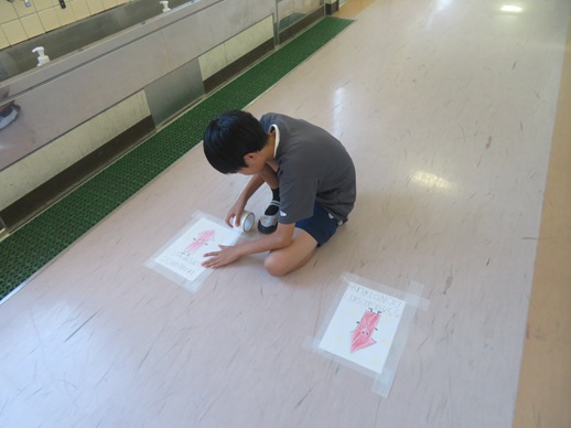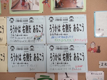 校内の廊下を歩いていると、これまでなかった掲示物が…。実は、2学期の生活目標に合わせて、6年生が作成したものだったのです。学校生活がよりよくなるように、どうしたら目標が達成できるか考え、実行に移すという、素晴らしい姿です。さらに、その表示を見て、「右側歩こうって書いてるで!」と声を掛け合っている低学年の姿も見られました。「気づき・考え・行動する」が体現できていて、素晴らしいと思いました。