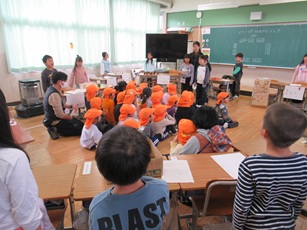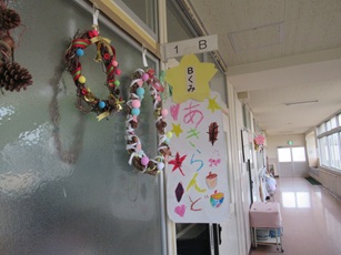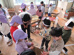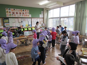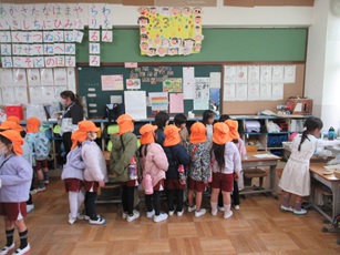すでに初冬に入ってしまいましたが… 1年生が小津こども園の年長さんを「秋ランド」にお招きしました。1年生は、この日にむけて落ち葉や木の実、段ボール、画用紙などを使って、「どうしたら5歳児さんに楽しんでもらえるだろう?」と考え、準備を進めてきました。A・B・C、それぞれのクラスに「つり屋さん」や「ボーリング」、「射的」など、小さな屋台がたくさん。1年生は「いらっしゃい、いらっしゃい!」と元気に呼び込みをしたり、遊び方のルールを教えたりしていました。
